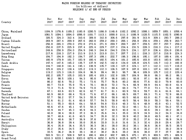 據(jù)2月15日美國財政部公布的數(shù)據(jù),截至2017年12月,中國持有美國國債1.18萬億美元,較上個月增持83億美元,為美國最大的海外債券持有國,其次為日本。2017年全年來看,中國共增持美國國債1265億美元,增持力度創(chuàng)下2010年以來最大。 按照外匯局的說法,整個2017年,中國國際收支狀況穩(wěn)健,跨境資金流動從凈流出轉(zhuǎn)為基本平衡。