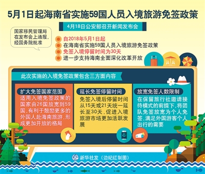 “擴(kuò)大免簽國范圍;延長免簽停留時間;放寬免簽人數(shù)限制。”4月18日,公安部在京召開新聞發(fā)布會,國家移民管理局在發(fā)布會上通報:經(jīng)國務(wù)院批準(zhǔn),自2018年5月1日起,在海南省實(shí)施59國人員入境旅游免簽政策,進(jìn)一步支持海南全面深化改革開放。
