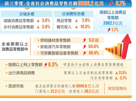 前三季度,全省消費(fèi)呈現(xiàn)哪些特點(diǎn)。據(jù)省統(tǒng)計(jì)局相關(guān)負(fù)責(zé)人介紹,新型消費(fèi)快速增長(zhǎng),全省限額以上消費(fèi)品零售額中,照相器材類零售額增長(zhǎng)5.3倍,新能源汽車零售額增長(zhǎng)55.0%,可穿戴智能設(shè)備零售額增長(zhǎng)49.4%。限額以上網(wǎng)上零售額增長(zhǎng)6.3%,明顯快于全省限上消費(fèi)品零售額增速;出行類商品銷售帶動(dòng)明顯,全省限額以上石油及制品類零售額增長(zhǎng)11.5%,汽車類零售額增長(zhǎng)3.7%;旅游市場(chǎng)持續(xù)回暖,全省重點(diǎn)監(jiān)測(cè)景區(qū)接待人數(shù)6600.6萬(wàn)人次,門(mén)票收入22.2億元,經(jīng)營(yíng)收入38.2億元,皆實(shí)現(xiàn)增長(zhǎng)。