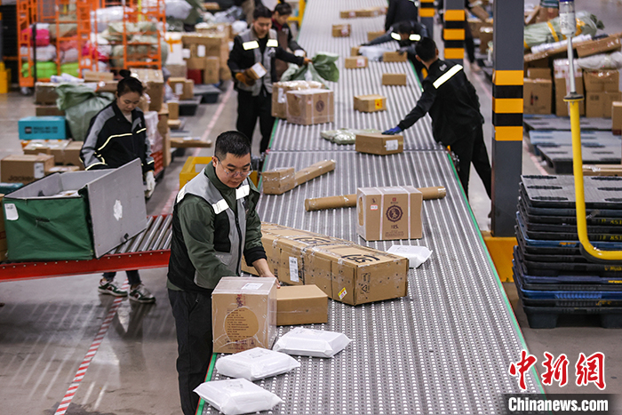 資料圖為2023年11月12日,工作人員在貴州順豐一中轉(zhuǎn)場(chǎng)分揀快遞。中新社記者 瞿宏倫 攝