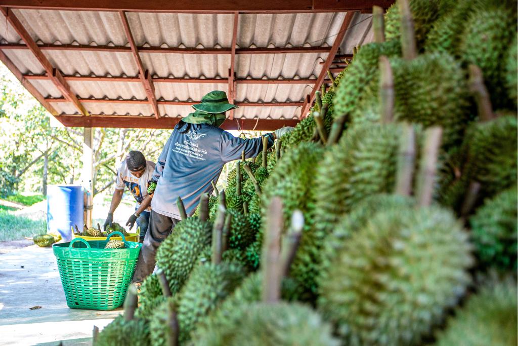 4月26日,在泰國尖竹汶府,工人在榴蓮園碼放榴蓮。新華社記者王騰攝