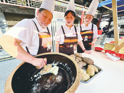 9月3日傍晚,太原鐘樓街,來自嵐縣的廚師正在制作當(dāng)?shù)靥厣朗惩炼埂澳酶狻薄=?,隨著“跟著悟空游山西”的持續(xù)升溫,太原鐘樓街吸引了眾多游客,品嘗富有山西特色的美食成為人們打卡鐘樓街的主要內(nèi)容。