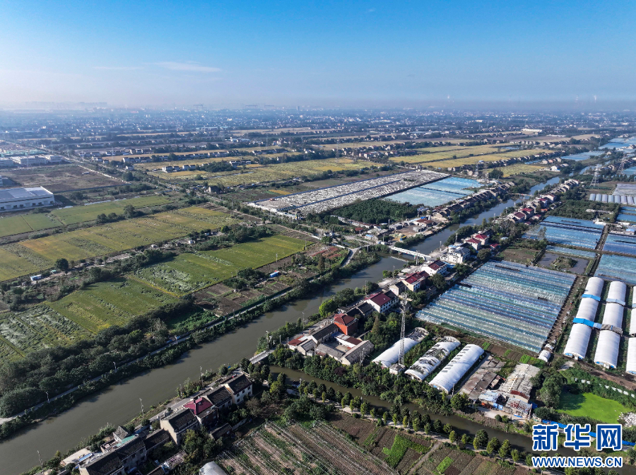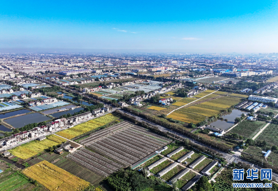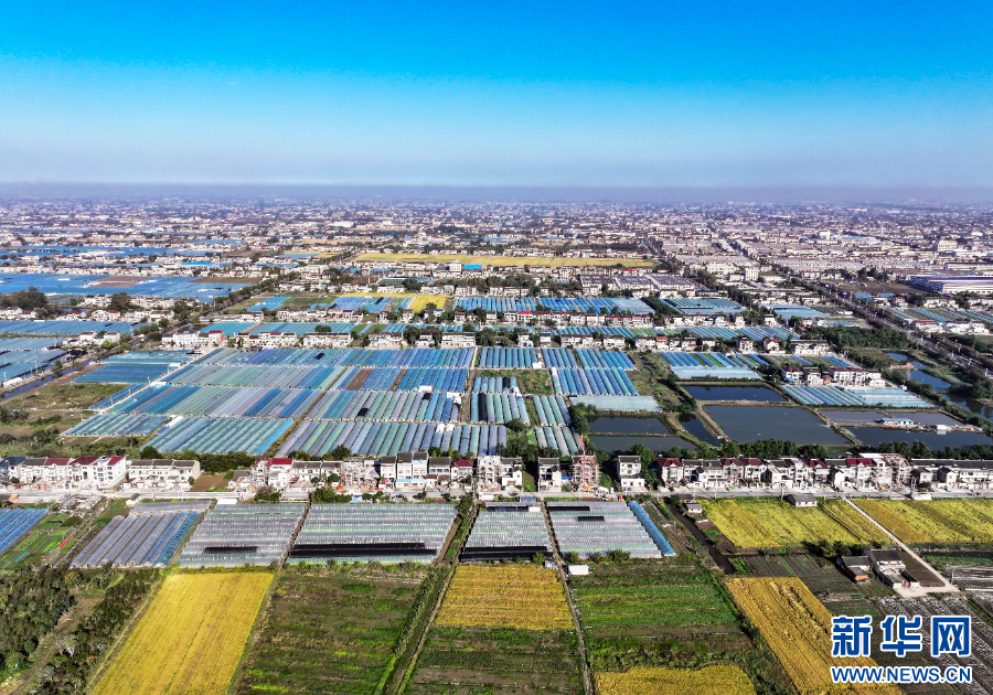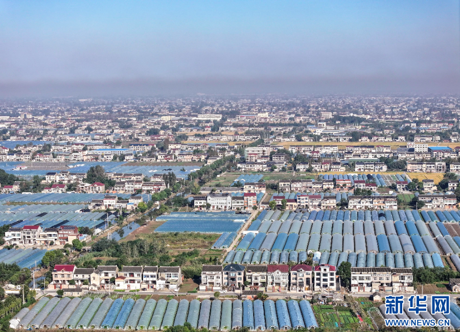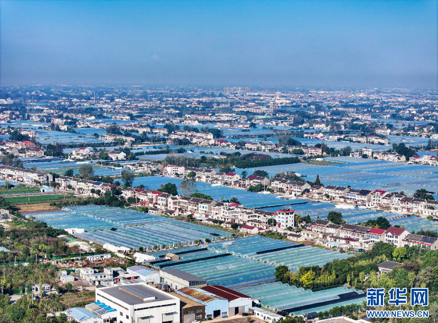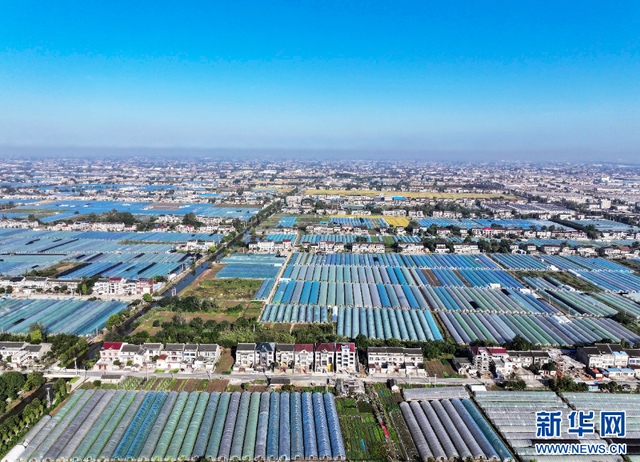 深秋時節(jié),從空中俯瞰江蘇省靖江市馬橋鎮(zhèn)橫港村,整片的蔬菜大棚、錯落有致的民居,田園風(fēng)光美如畫卷。