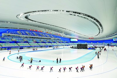 在北京國家速滑館,參加速度滑冰的小選手們在賽前熱身。新華社發(fā)