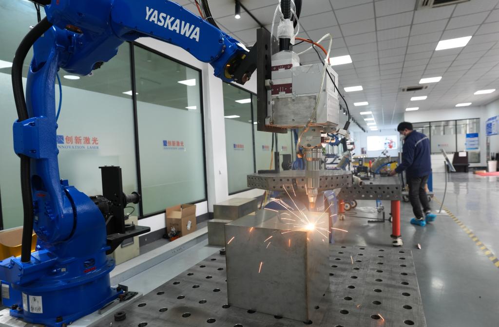 1月7日,紹興市上虞區(qū)浙江創(chuàng)新激光設(shè)備有限公司的機(jī)械臂對(duì)不銹鋼產(chǎn)品進(jìn)行無縫激光焊接。 新華社照片,紹興(浙江)(2025年1月7日)新華社記者 翁忻旸 攝