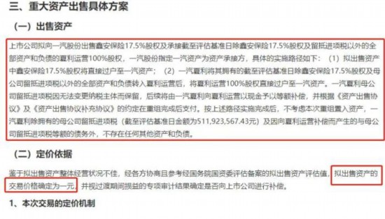 鑒于擬出售資產(chǎn)整體經(jīng)營狀況不佳,經(jīng)各方協(xié)商且參考經(jīng)國務(wù)院國資委評估備案的擬出售資產(chǎn)評估值,一汽夏利擬出售資產(chǎn)的交易價(jià)格確定為1元。