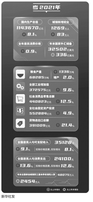 國內(nèi)生產(chǎn)總值(GDP)達(dá)114.4萬億元、人均GDP突破8萬元、最終消費(fèi)支出貢獻(xiàn)率為65.4%…… 國家統(tǒng)計局2月28日發(fā)布的2021年國民經(jīng)濟(jì)和社會發(fā)展統(tǒng)計公報顯示,2021年,面對百年變局和世紀(jì)疫情,全國上下共同努力,我國經(jīng)濟(jì)發(fā)展和疫情防控保持全球領(lǐng)先地位,構(gòu)建新發(fā)展格局邁出新步伐,高質(zhì)量發(fā)展取得新成效,實現(xiàn)了“十四五”良好開局。 2021年,我國GDP比上年增長8.1% 公報顯示,2021年,我國GDP比上年增長8.1%,兩年平均增長5.1%,在全球主要經(jīng)濟(jì)體中名列前茅;經(jīng)濟(jì)規(guī)模突破110萬億元,達(dá)到114.4萬億元,穩(wěn)居全球第二大經(jīng)濟(jì)體。人均GDP突破8萬元。 “2021年,按年平均匯率折算,我國經(jīng)濟(jì)總量達(dá)到17.7萬億美元,預(yù)計占世界經(jīng)濟(jì)的比重超過18%,對世界經(jīng)濟(jì)增長的貢獻(xiàn)率達(dá)到25%左右?!眹医y(tǒng)計局副局長盛來運(yùn)說。 據(jù)介紹,我國持續(xù)深化“放管服”改革,穩(wěn)步推進(jìn)高標(biāo)準(zhǔn)市場體系建設(shè),不斷強(qiáng)化創(chuàng)新驅(qū)動,科技促發(fā)展作用日益增強(qiáng)。 公報顯示,2021年我國發(fā)展新動能增勢良好。規(guī)模以上高技術(shù)制造業(yè)增加值比上年增長18.2%,快于規(guī)模以上工業(yè)8.6個百分點(diǎn);戰(zhàn)略性新興服務(wù)業(yè)企業(yè)營業(yè)收入比上年增長16.0%。 節(jié)能減排扎實推進(jìn)。2021年,全國萬元國內(nèi)生產(chǎn)總值能耗比上年下降2.7%,重點(diǎn)耗能工業(yè)企業(yè)單位電石綜合能耗下降5.3%,萬元國內(nèi)生產(chǎn)總值二氧化碳排放下降3.8%。 亮眼成績來之不易,更需保持清醒頭腦。18.3%、7.9%、4.9%、4.0%……2021年持續(xù)放緩的季度增速,既有上年基數(shù)影響,也凸顯經(jīng)濟(jì)運(yùn)行面臨壓力。 既要正視困難,更要增強(qiáng)信心。按兩年平均算,一、二、三、四季度經(jīng)濟(jì)分別增長4.9%、5.5%、4.9%、5.2%,四季度兩年平均增長率比三季度還高一些;從環(huán)比增速看,四季度比三季度加快0.9個百分點(diǎn),經(jīng)濟(jì)企穩(wěn)態(tài)勢逐步顯現(xiàn)。 多重壓力下,今年我國穩(wěn)外貿(mào)仍然具有有利條件 “百年變局和世紀(jì)疫情沖擊下全球經(jīng)貿(mào)合作遭遇逆流,我國頂住壓力,堅定不移擴(kuò)大對外開放,持續(xù)拓展對外開放范圍、領(lǐng)域和層次,致力維護(hù)全球產(chǎn)業(yè)鏈供應(yīng)鏈穩(wěn)定,推進(jìn)共建‘一帶一路’,為全球合作發(fā)展注入新動力?!笔磉\(yùn)說。 對外貿(mào)易量增質(zhì)升。2021年貨物進(jìn)出口總額39.1萬億元,比上年增長21.4%,按年平均匯率折算已超過6萬億美元,連續(xù)5年蟬聯(lián)全球貨物貿(mào)易第一位。貿(mào)易新業(yè)態(tài)蓬勃發(fā)展,2021年跨境電商、市場采購出口額分別比上年增長24.5%、32.1%。 公報顯示,2021年,我國實際使用外商直接投資金額1.1萬億元,比上年增長14.9%,首次突破1萬億元,其中服務(wù)業(yè)、高技術(shù)產(chǎn)業(yè)實際使用外資分別增長16.7%、17.1%,利用外資結(jié)構(gòu)不斷改善。 共建“一帶一路”走深走實。2021年,我國對“一帶一路”沿線國家進(jìn)出口額11.6萬億元,比上年增長23.6%;中歐班列開行量超過1.5萬列,增長22.0%。 自貿(mào)區(qū)建設(shè)擴(kuò)圍提效。制度型開放高地建設(shè)成效顯現(xiàn),2021年,綜合保稅區(qū)、自由貿(mào)易試驗區(qū)、海南自由貿(mào)易港進(jìn)出口額分別比上年增長24.3%、26.4%、57.7%。 然而,亮眼數(shù)據(jù)背后,并非沒有隱憂。芯片短缺、運(yùn)費(fèi)高位徘徊、原材料價格上漲,見訂單不見效益、有單不敢接——對于去年登上高“坡”的外貿(mào)企業(yè)而言,今年面臨的挑戰(zhàn)較為艱巨。 專家分析,多重壓力下,今年我國穩(wěn)外貿(mào)仍然具有有利條件,區(qū)域全面經(jīng)濟(jì)伙伴關(guān)系協(xié)定生效實施、跨境電子商務(wù)綜合試驗區(qū)再擴(kuò)圍,外貿(mào)新業(yè)態(tài)新模式加速發(fā)展,成為拉動經(jīng)濟(jì)增長新引擎。 教育文化體育繁榮發(fā)展,健康中國穩(wěn)步推進(jìn) 公報顯示,2021年全國居民人均可支配收入35128元,比上年實際增長8.1%,快于人均GDP增速,與GDP增速同步。 值得注意的是,脫貧縣居民收入快速增長。2021年,脫貧縣農(nóng)村居民人均可支配收入14051元,比上年名義增長11.6%,實際增長10.8%,快于全國農(nóng)村居民人均可支配收入增速。 教育文化體育繁榮發(fā)展。2021年,九年義務(wù)教育鞏固率、高中階段毛入學(xué)率均比上年提高0.2個百分點(diǎn)。全民健身條件持續(xù)改善,2021年末,全國體育場地397.1萬個,比上年末增加25.8萬個。 健康中國穩(wěn)步推進(jìn)。2021年末,全國醫(yī)療衛(wèi)生機(jī)構(gòu)、醫(yī)療衛(wèi)生機(jī)構(gòu)床位、衛(wèi)生技術(shù)人員分別為103.1萬個、957萬張、1123萬人,分別比上年末增加0.8萬個、47萬張、55萬人。 社會保障網(wǎng)織密織牢。2021年末全國基本養(yǎng)老保險覆蓋超10億人,基本醫(yī)療保險覆蓋超13億人。 經(jīng)濟(jì)發(fā)展面臨需求收縮、供給沖擊、預(yù)期轉(zhuǎn)弱三重壓力,一些地方財政收支和保民生壓力加大,市場主體特別是中小微企業(yè)、個體工商戶困難增多……展望2022年全年,中國經(j