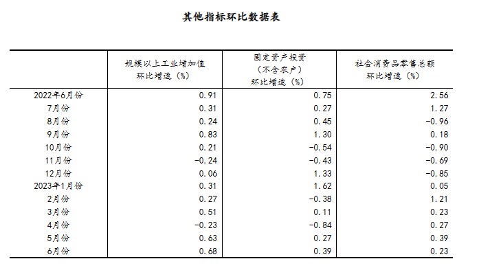 (2)根據(jù)季節(jié)調(diào)整模型自動修正結(jié)果,對近一年來各期國內(nèi)生產(chǎn)總值、規(guī)模以上工業(yè)增加值、固定資產(chǎn)投資(不含農(nóng)戶)、社會消費品零售總額環(huán)比增速進(jìn)行修訂。修訂結(jié)果及2023年二季度GDP環(huán)比數(shù)據(jù)、2023年6月份其他指標(biāo)環(huán)比數(shù)據(jù)如下: