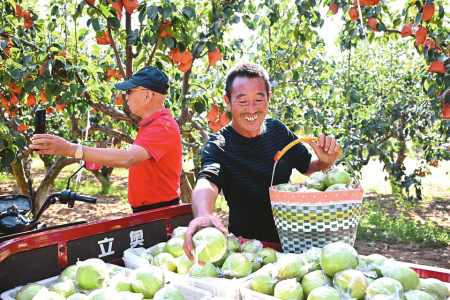 隰縣龍泉鎮(zhèn)上留村玉露香梨示范園農(nóng)民喜摘豐收的果子。金建強(qiáng)攝