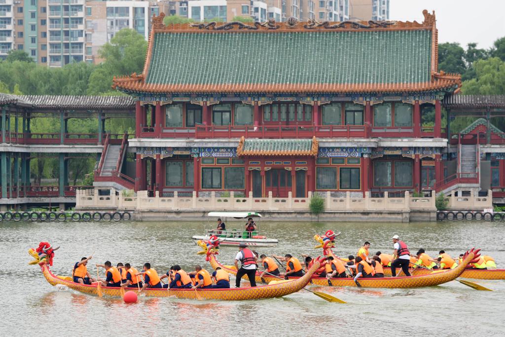 6月5日,2024龍?zhí)抖宋缥幕?jié)活動在北京市東城區(qū)龍?zhí)豆珗@舉辦。這是2024龍?zhí)抖宋缥幕?jié)龍舟比賽現(xiàn)場。新華社記者 鞠煥宗 攝