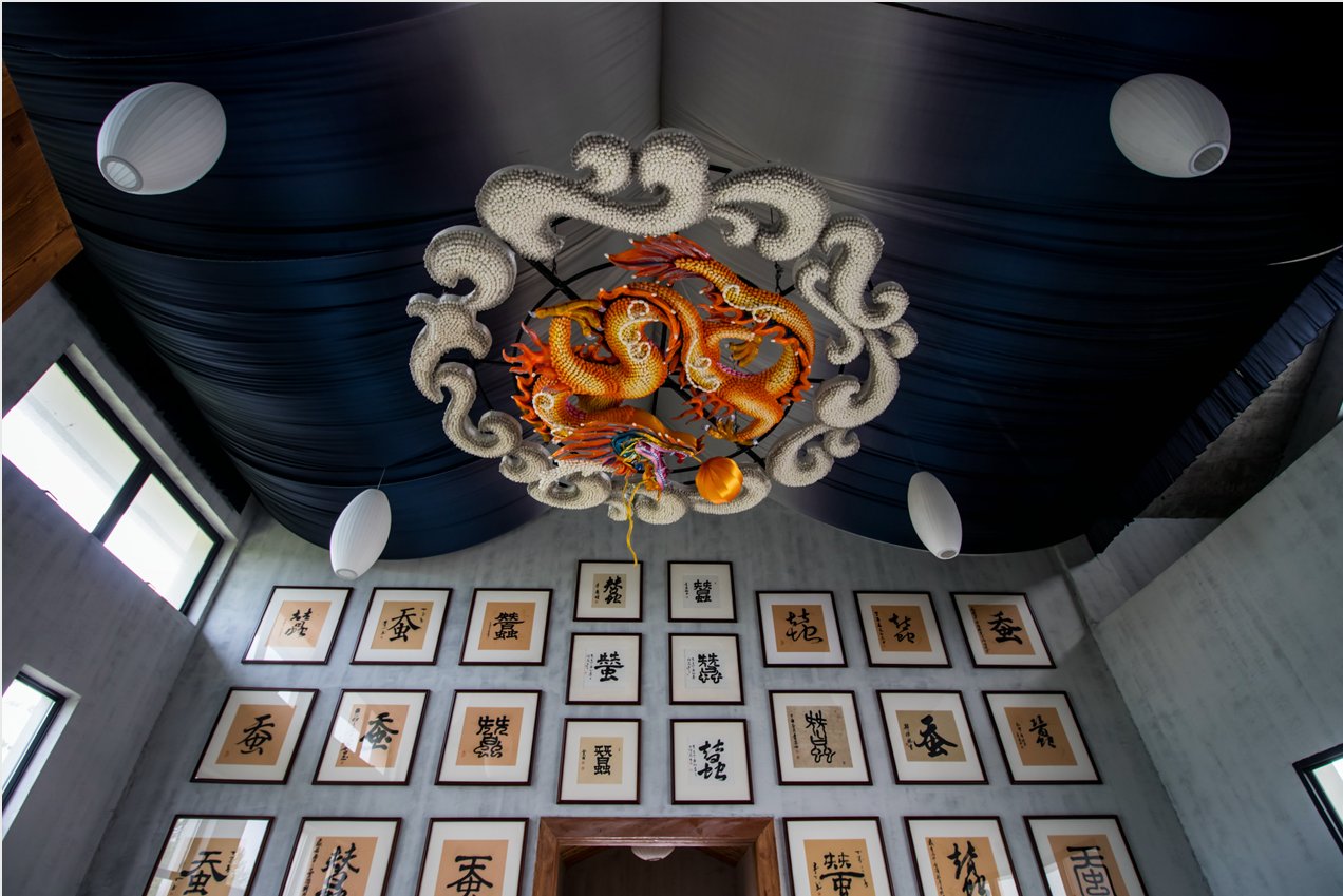 走入云龍村的云龍記憶館,縱使見多識(shí)廣,全國(guó)主流媒體記者們也依然被盤旋于頂?shù)拇T大金龍震撼到了,紛紛掏出手機(jī)拍個(gè)不停:這條金龍是用15000多個(gè)蠶繭制作而成,外圍是蠶繭組成的祥云,包裹著里面的金龍,這是云龍村的象征。