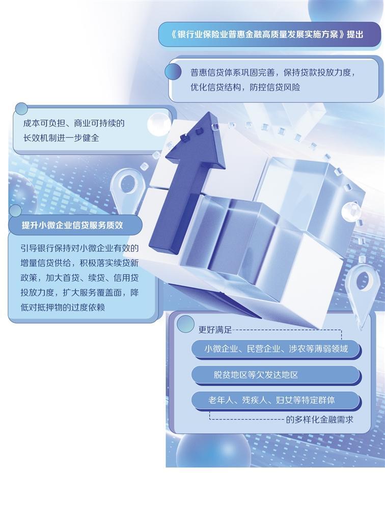 □ 本報記者 勾明揚 近年來,我國普惠金融發(fā)展取得長足進步,金融服務(wù)的普惠性不斷提升。近期印發(fā)的《銀行業(yè)保險業(yè)普惠金融高質(zhì)量發(fā)展實施方案》(以下簡稱《實施方案》)在主要目標中提出,普惠信貸體系鞏固完善,保持貸款投放力度,優(yōu)化信貸結(jié)構(gòu),防控信貸風(fēng)險,成本可負擔、商業(yè)可持續(xù)的長效機制進一步健全,更好滿足小微企業(yè)、民營企業(yè)、涉農(nóng)等薄弱領(lǐng)域,脫貧地區(qū)等欠發(fā)達地區(qū)以及老年人、殘疾人、婦女等特定群體的多樣化金融需求。 “雪中送炭、服務(wù)民生”是普惠金融的題中之義?!秾嵤┓桨浮返挠“l(fā)將引導(dǎo)銀行業(yè)保險業(yè)進一步提升普惠金融服務(wù)人民群眾生產(chǎn)生活的能力和水平。 查缺補漏完善體系 “普惠金融的初衷是為社會所有階層和群體提供金融服務(wù),實現(xiàn)經(jīng)濟的包容性增長。”招聯(lián)首席研究員董希淼告訴記者,在過去幾年普惠信貸規(guī)??焖僭鲩L、資產(chǎn)質(zhì)量壓力增大的情況下,金融機構(gòu)繼續(xù)推動普惠金融特別是普惠信貸高質(zhì)量發(fā)展時,一定程度上存在內(nèi)生動力不充足的問題,也存在外部激勵約束作用發(fā)揮不充分的問題。 中國郵政儲蓄銀行研究員婁飛鵬也表示,在發(fā)展普惠金融過程中,存在一些群體的合理金融需求特別是融資需求得不到有效滿足以及普惠金融服務(wù)不夠優(yōu)惠的問題。為此,需要重點圍繞滿足客戶群體合理融資需求的目標,從豐富抵質(zhì)押物類型、創(chuàng)新信用類貸款產(chǎn)品、利用數(shù)字技術(shù)線上作業(yè)降低金融服務(wù)成本等方面,為廣大客戶提供優(yōu)質(zhì)信貸服務(wù)。 國家金融監(jiān)督管理總局、中國人民銀行有關(guān)司局負責(zé)人在答記者問時說,《實施方案》明確,未來五年,基本建成高質(zhì)量綜合普惠金融體系,普惠金融促進共同富裕邁上新臺階。普惠金融服務(wù)體系持續(xù)優(yōu)化,普惠信貸體系鞏固完善,普惠保險體系逐步健全。 “作為3項重點工作任務(wù)之一,鞏固提升普惠信貸體系和能力的核心在于夯實基礎(chǔ)并優(yōu)化效能,這為更好發(fā)展普惠金融指明了方向。”中國銀行研究院研究員吳丹認為,接下來需要夯實普惠信貸的現(xiàn)有基礎(chǔ),運用大數(shù)據(jù)、人工智能優(yōu)化風(fēng)控與服務(wù)效率,增強風(fēng)控精準性、降低運營成本,加強技術(shù)賦能對傳統(tǒng)服務(wù)短板的補足效應(yīng)。還需要增強普惠信貸服務(wù)能力,擴展服務(wù)網(wǎng)絡(luò),提升觸達效率,適配滿足長尾客群差異化需求的創(chuàng)新產(chǎn)品。 董希淼補充道,可以從體制機制、基礎(chǔ)設(shè)施、產(chǎn)品服務(wù)、考核激勵等方面采取針對性措施。比如,改進普惠信貸服務(wù)考核體系,破解融資難和融資貴問題;拓寬商業(yè)銀行特別是中小銀行不良資產(chǎn)處置的渠道,豐富處置方式和手段;加大對商業(yè)銀行特別是中小銀行的正向激勵,同時防范信貸供給過度和資金被挪用等問題。“金融機構(gòu)應(yīng)根據(jù)自身的資源稟賦,選擇適合的普惠信貸服務(wù)模式。”董希淼說。 服務(wù)質(zhì)效不斷提升 完善普惠信貸管理體系,是推動普惠金融高質(zhì)量發(fā)展的重要一環(huán)。《實施方案》提出,建立健全包括小微企業(yè)、民營企業(yè)、“三農(nóng)”、重點幫扶群體在內(nèi)的普惠信貸體系,科學(xué)設(shè)定監(jiān)管目標,加強監(jiān)測督導(dǎo)。完善監(jiān)管評價評估機制、信貸政策導(dǎo)向效果評估機制,優(yōu)化指標設(shè)置,突出實效評價,強化結(jié)果運用。及時修訂普惠信貸監(jiān)管制度,優(yōu)化發(fā)展環(huán)境、促進可持續(xù)發(fā)展。 婁飛鵬認為,這些舉措將提升金融監(jiān)管質(zhì)效,通過完善評估機制,更好地引導(dǎo)金融機構(gòu)加大普惠金融發(fā)展力度、提升發(fā)展質(zhì)量,將普惠金融高質(zhì)量發(fā)展落到實處。 作為國民經(jīng)濟重要主體,小微企業(yè)是普惠金融服務(wù)的重點對象?!秾嵤┓桨浮访鞔_提出,提升小微企業(yè)信貸服務(wù)質(zhì)效。引導(dǎo)銀行保持對小微企業(yè)有效的增量信貸供給,積極落實續(xù)貸新政策,加大首貸、續(xù)貸、信用貸投放力度,擴大服務(wù)覆蓋面,降低對抵押物的過度依賴。提高小微企業(yè)融資服務(wù)定價管理能力,促進綜合融資成本穩(wěn)中有降。 中國人民銀行發(fā)布的2025年一季度金融機構(gòu)貸款投向統(tǒng)計報告顯示,今年一季度末,人民幣普惠小微貸款余額34.81萬億元,同比增長12.2%,增速比各項貸款高4.8個百分點,一季度增加1.9萬億元。其中,對科技型中小企業(yè)的支持尤為明顯。 甘肅皓天醫(yī)藥科技有限公司(簡稱“皓天醫(yī)藥”)是一家專注于化學(xué)原料藥、醫(yī)藥中間體研發(fā)、生產(chǎn)與銷售的國家級高新技術(shù)企業(yè)。作為生物醫(yī)藥產(chǎn)業(yè)鏈上游供應(yīng)商,皓天醫(yī)藥為國內(nèi)外大型醫(yī)藥工廠及眾多下游藥企提供關(guān)鍵的醫(yī)藥中間體和原料藥。隨著業(yè)務(wù)規(guī)模不斷擴大,企業(yè)面臨的資金周轉(zhuǎn)壓力也隨之增加。 皓天醫(yī)藥總經(jīng)理朱軍龍說,談成訂單后企業(yè)急需購買原材料,但流動