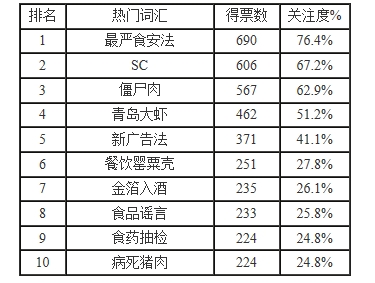 據(jù)悉,本次活動(dòng)首先由食品伙伴網(wǎng)的“食品論壇”板塊網(wǎng)友針對(duì)2015年的熱門事件概括成一個(gè)關(guān)鍵詞,之后經(jīng)過(guò)整理篩選出20個(gè)候選詞匯,并于2016年1月21日-2月17日在食品論壇投票。期間共有 902位經(jīng)過(guò)審核認(rèn)證的注冊(cè)網(wǎng)友參與投票,最終選出十大熱門詞匯。