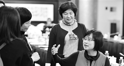 3月11日,人大廣東代表團在駐地舉行分組會議。全國人大代表龍芳(右一)、李淑明(右二)與同團代表在討論“一帶一路”戰(zhàn)略對廣東企業(yè)“走出去”產(chǎn)生的影響。本報記者 李景錄攝