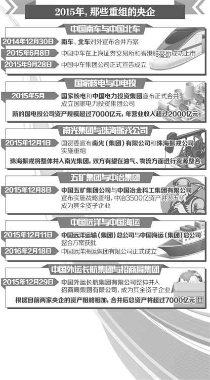 2015年,央業(yè)重組邁出重要步伐。有6對12家企業(yè)完成了重組,涉及至少27家上市公司,一批包括裝備制造、能源、航運在內(nèi)的央企實現(xiàn)兼并重組,中央企業(yè)也由112家減至106家。2016年以來,繼1月25日中材集團與中建集團發(fā)布公告稱實施戰(zhàn)略重組之后,中國國旅集團與中國港中旅集團也發(fā)布公告稱籌劃戰(zhàn)略重組。此外,中航動力、成發(fā)科技、中航動控三家公司則于日前發(fā)布重組公告。離國務(wù)院國資委直接監(jiān)管的中央企業(yè)數(shù)量減至100家僅有“一步之遙”。