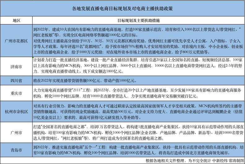 各地發(fā)展直播電商目標規(guī)劃及對電商主播扶助政策
