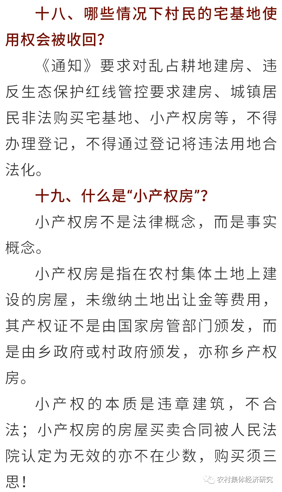 二十、城鎮(zhèn)居民能否到農(nóng)村購(gòu)置宅基地?不能,《通知》要求,嚴(yán)禁城鎮(zhèn)居民到農(nóng)村購(gòu)買(mǎi)宅基地,嚴(yán)禁下鄉(xiāng)利用宅基地建設(shè)別墅大院和私人會(huì)館,嚴(yán)禁借流轉(zhuǎn)之名違法違規(guī)圈占、買(mǎi)賣(mài)宅基地。
