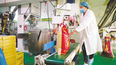 位于蔡家會鎮(zhèn)的興縣山花爛漫農(nóng)業(yè)綜合開發(fā)有限公司,日精加工50噸谷子成套設(shè)備生產(chǎn)流水線上,經(jīng)過初篩、精選、加工、包裝后的袋裝小米經(jīng)過傳輸帶被送往庫房,等待裝車發(fā)貨。“我們的產(chǎn)品涵蓋有機(jī)小米、綠豆、莜面、豇豆面、亞麻籽油等,年加工雜糧、油料可達(dá)4萬多噸。”公司董事長賀虎平介紹,自2005年“山花爛漫”商標(biāo)注冊以來,已與興縣50多個自然村,916戶農(nóng)戶,簽訂訂單農(nóng)業(yè)近3萬畝,其中脫貧戶430多戶,戶均收入達(dá)到1.5萬余元/年。