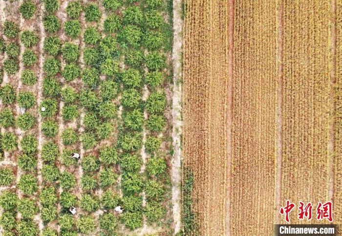 山西省運(yùn)城市新絳縣澤掌鎮(zhèn)喬溝頭村,幾名花農(nóng)在田間采摘金銀花。(無人機(jī)照片)高新生 攝