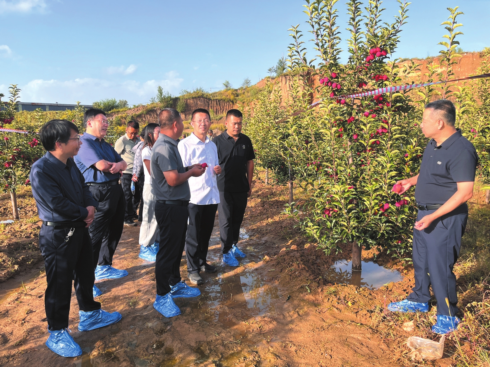 觀摩期間,技術人員全面介紹了示范果園的建設背景、關鍵栽培技術及主要管理措施,重點講解了河曲紅海棠的品種特性、創(chuàng)新技術應用成效等核心亮點。參會人員深入田間,實地察看果樹長勢與掛果情況,并與技術團隊現(xiàn)場交流,詳細了解配套栽培措施、季節(jié)性管理要點及該品種在新技術模式下的實際生長狀況,進一步加深了對對品種優(yōu)勢與技術推廣成效的認識。