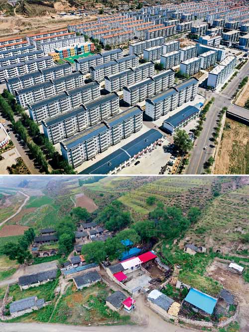 近年來,山西堅(jiān)持抓減負(fù)、重落實(shí),把基層工作聚焦到鄉(xiāng)村振興與脫貧攻堅(jiān)、社區(qū)服務(wù)與基層治理、服務(wù)中心與保障大局上來。目前,山西全省58個(gè)貧困縣已全部摘帽,3350個(gè)深度貧困自然村整體搬遷全部完成。圖片為拼版照片,上圖為2020年5月20日拍攝的山西省忻州市岢嵐縣廣惠園移民新區(qū),下圖為2017年6月22日拍攝的岢嵐縣趙家洼村,部分趙家洼村村民目前已搬遷居住到了廣惠園移民新區(qū)。 新華社記者 曹陽(yáng)/攝