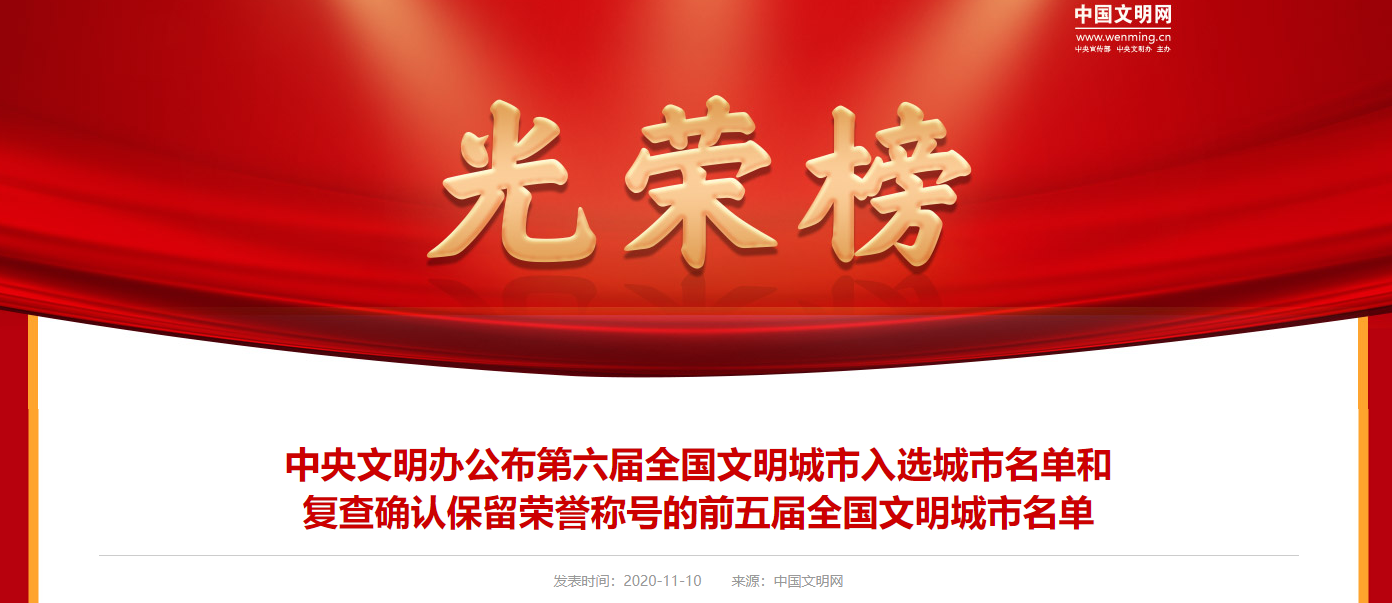 2020年8月以來,中央文明辦按照城市自主申報(bào)、省級擇優(yōu)推薦、中央部委審核、媒體集中公示、組織綜合測評、確定入選城市等評選辦法和程序,嚴(yán)謹(jǐn)規(guī)范組織第六屆全國文明城市評選工作,嚴(yán)格依據(jù)參評城市2018、2019、2020年三年測評總成績排名,提出第六屆全國文明城市入選城市名單,報(bào)中央文明委領(lǐng)導(dǎo)同志批準(zhǔn)。同時,中央文明辦按照城市自查、省級審核、中央把關(guān)、組織測評等復(fù)查辦法和程序,認(rèn)真做好前五屆全國文明城市復(fù)查工作,嚴(yán)格依據(jù)全國文明城市復(fù)查測評成績,提出繼續(xù)保留榮譽(yù)稱號的全國文明城市名單,報(bào)中央文明委領(lǐng)導(dǎo)同志批準(zhǔn)?,F(xiàn)將第六屆全國文明城市入選城市名單和復(fù)查確認(rèn)保留榮譽(yù)稱號的前五屆全國文明城市名單公布如下。