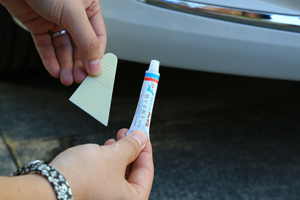 可以看到這輛車的劃痕傷至底漆了,為了更好的固漆,我們需要進(jìn)行簡單的補(bǔ)土或者叫打膩子,對凹凸不平之處也可以很好的找平。這種小管的補(bǔ)土很便宜,電商賣10元左右,而全套的補(bǔ)漆工具不足百元。