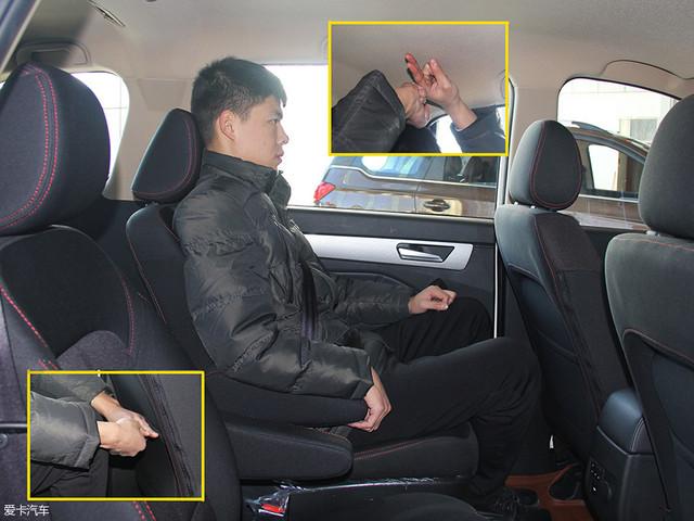 第二排為兩個獨立座椅,座椅填充和前排保持一致,乘坐感受同樣舒適,頭枕高度可調。前排座椅位置保持不變,同一位模特坐進第二排,頭部空間剩余一拳三指,腿部空間剩余一拳兩指。