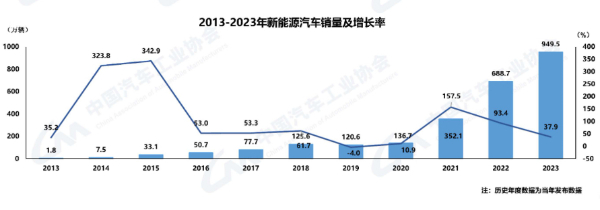 據(jù)中汽協(xié)統(tǒng)計(jì)分析,2023年我國新能源汽車產(chǎn)銷分別完成958.7萬輛和949.5萬輛,同比分別增長35.8%和37.9%,市場占有率達(dá)31.6%。