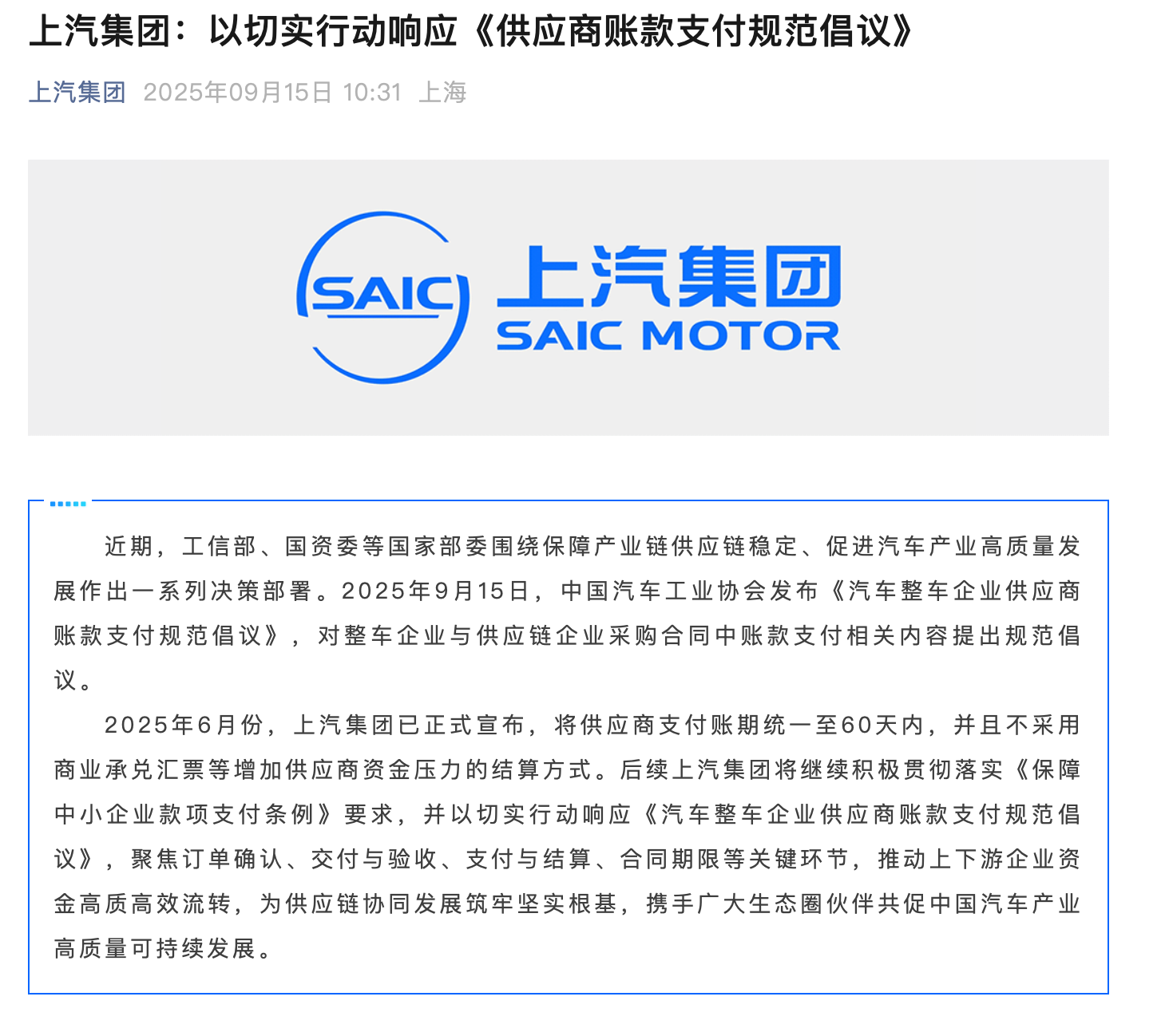 以下為《汽車整車企業(yè)供應(yīng)商賬款支付規(guī)范倡議》原文。
