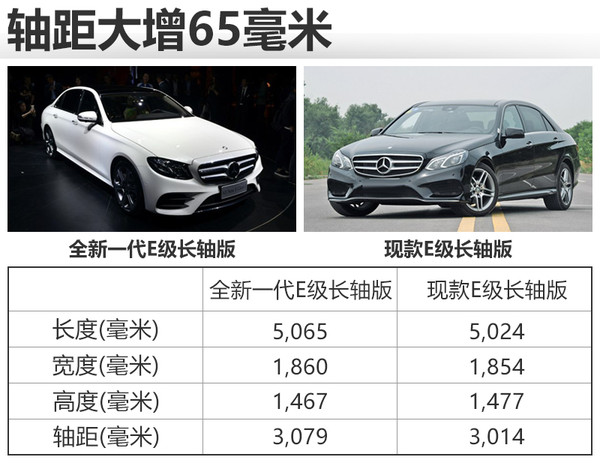 全新一代E級長軸距轎車基于奔馳MRA(后驅/四驅)模塊化平臺打造,在設計上更趨向家族化,外觀與奔馳S級更加接近。新車針對中國市場推出長軸距版,尺寸大幅增加,同時標準軸距車型也將保留,此外,新車北京奔馳進行投產(chǎn),將推出E 200L、E 200L運動、E 300L、E 300L運動、E 300L高配、E 300L運動高配共計6款車型。