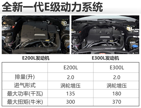 動力方面,新車將搭載兩款不同調校的2.0T渦輪增壓發(fā)動機,其中E200L是沿用現(xiàn)款車型上的2.0T發(fā)動機,最大功率135千瓦,最大扭計300牛米;E300L發(fā)動機則擁有更強的動力,最大功率180千瓦,最大扭矩達到370牛米。