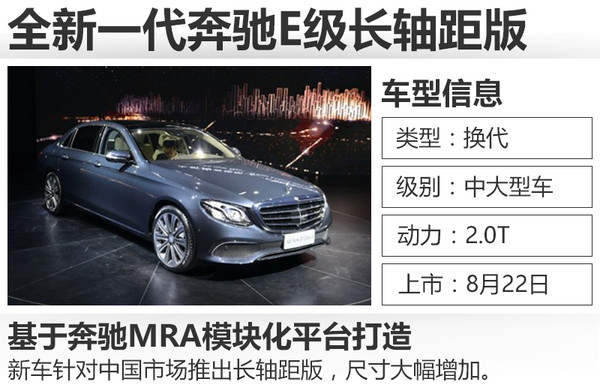 全新一代奔馳E級長軸距于上個月在北京奔馳亦莊工廠正式下線,新車針對中國市場的需求進行了全面優(yōu)化,從外觀、內飾到車身尺寸都有明顯提升。網(wǎng)通社從梅賽德斯-奔馳官方了解到,全新一代奔馳E級長軸距版將于8月22日在北京正式上市。新車采用不同調校的2.0T發(fā)動機,并首次搭載9速自動變速箱。