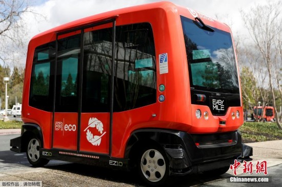 當?shù)貢r間3月6日,美國加州畢曉普蘭奇,法國EasyMile公司生產(chǎn)的無人駕駛公交車EZ10正在當?shù)夭渴饻y試。