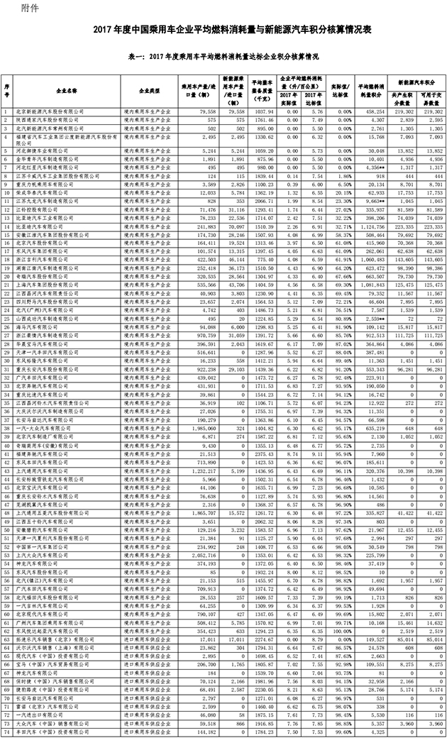 工業(yè)和信息化部、商務(wù)部、海關(guān)總署、市場監(jiān)管總局聯(lián)合發(fā)布公告(工業(yè)和信息化部 商務(wù)部 海關(guān)總署 市場監(jiān)管總局公告 2018年 第34號)公布2017年度乘用車企業(yè)平均燃料消耗量與新能源汽車積分核算情況。 按照《乘用車企業(yè)平均燃料消耗量與新能源汽車積分并行管理辦法》的規(guī)定,自即日起,企業(yè)可通過乘用車企業(yè)平均燃料消耗量與新能源汽車積分管理平臺(網(wǎng)址:http://cafcnev.miit-eidc.org.cn)開展平均燃料消耗量積分轉(zhuǎn)/受讓、新能源汽車積分交易、提交平均燃料消耗量負(fù)積分抵償報告等工作。 以下為公告原文: 中華人民共和國工業(yè)和信息化部 商務(wù)部 海關(guān)總署 市場監(jiān)管總局公告 2018年 第34號 根據(jù)《關(guān)于2016年度、2017年度乘用車企業(yè)平均燃料消耗量管理有關(guān)工作的通知》(工信部聯(lián)裝﹝2017﹞266號))要求,現(xiàn)將2017年度中國乘用車企業(yè)平均燃料消耗量與新能源汽車積分情況予以公告。 2017年度,中國境內(nèi)130家乘用車企業(yè)共生產(chǎn)/進(jìn)口乘用車2469.29萬輛(含新能源乘用車,不含出口乘用車,下同),行業(yè)平均整車整備質(zhì)量為1438公斤,平均燃料消耗量實際值為6.05升/100公里,燃料消耗量正積分為1238.14萬分,燃料消耗量負(fù)積分為168.90萬分,新能源汽車正積分為179.32萬分。 其中,101家境內(nèi)乘用車生產(chǎn)企業(yè)累計生產(chǎn)乘用車2367.46萬輛,平均整車整備質(zhì)量為1419公斤,平均燃料消耗量實際值為6.00升/100公里,燃料消耗量正積分為1200.91萬分,燃料消耗量負(fù)積分為149.02萬分,新能源汽車正積分為168.69萬分。29家進(jìn)口乘用車供應(yīng)企業(yè)進(jìn)口乘用車101.83萬輛,平均整車整備質(zhì)量為1875公斤,平均燃料消耗量實際值為7.13升/100公里,燃料消耗量正積分為37.23萬分,燃料消耗量負(fù)積分為19.88萬分,新能源汽車正積分為10.63萬分。 特此公告。 附件:2017年度中國乘用車企業(yè)平均燃料消耗量與新能源汽車積分核算情況表.pdf 工業(yè)和信息化部 商務(wù)部 海關(guān)總署 市場監(jiān)管總局 2018年6月29日
