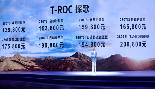 7月30日, 一汽-大眾首款SUV——T-ROC探歌在深圳上市。新車提供200TSI、230TSI和280TSI三款動(dòng)力選擇,并提供四驅(qū)版本,共8款車型,售價(jià)區(qū)間13.98-20.98萬元。