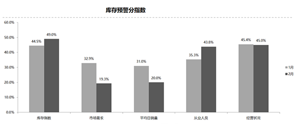從庫存預(yù)警分指數(shù)來看,庫存指數(shù)、從業(yè)人員指數(shù)環(huán)比上升;市場銷量指數(shù)、平均日銷量指數(shù)、經(jīng)營狀況指數(shù)環(huán)比下降。樊宇表示,2月庫存預(yù)警指數(shù)較高,依然位于50%的警戒線之上。同時,因為市場需求和平均日銷量呈明顯下降狀態(tài),經(jīng)銷商面臨較大壓力。