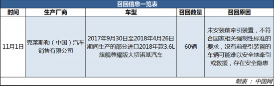 中國(guó)網(wǎng)汽車(chē)11月4日訊 近日,克萊斯勒(中國(guó))汽車(chē)銷(xiāo)售有限公司根據(jù)《缺陷汽車(chē)產(chǎn)品召回管理?xiàng)l例》和《缺陷汽車(chē)產(chǎn)品召回管理?xiàng)l例實(shí)施辦法》的要求,向國(guó)家市場(chǎng)監(jiān)督管理總局備案了召回計(jì)劃。決定自11月1日起,召回2017年9月30日至2018年4月26日期間生產(chǎn)的部分進(jìn)口2018年款3.6L旗艦尊耀版大切諾基汽車(chē),共計(jì)60輛。