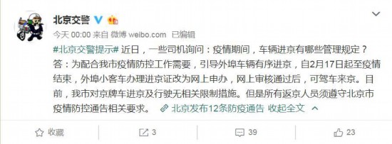 據(jù)介紹,近日一些司機(jī)詢問,疫情期間車輛進(jìn)京有哪些管理規(guī)定?北京交警表示,為配合北京市疫情防控工作需要,引導(dǎo)外埠車輛有序進(jìn)京,自2月17日起至疫情結(jié)束,外埠小客車辦理進(jìn)京證改為網(wǎng)上申辦,網(wǎng)上審核通過后,可駕車來京。目前,北京市對(duì)京牌車進(jìn)京及行駛無相關(guān)限制措施。但是所有返京人員須遵守北京市疫情防控通告相關(guān)要求。