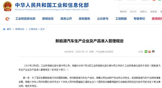人民網(wǎng)北京8月20日電(王紫)19日,工信部正式發(fā)布了修改后的《新能源汽車生產(chǎn)企業(yè)及產(chǎn)品準(zhǔn)入管理規(guī)定》(以下簡稱“規(guī)定”)?!兑?guī)定》刪除了包括第五條以及《新能源汽車生產(chǎn)企業(yè)準(zhǔn)入審查要求》等附件中有關(guān)“設(shè)計(jì)開發(fā)能力”的相關(guān)內(nèi)容;將新能源汽車生產(chǎn)企業(yè)停止生產(chǎn)的時間由12個月調(diào)整為24個月;刪除了有關(guān)新能源汽車生產(chǎn)企業(yè)申請準(zhǔn)入的過渡期臨時條款。《規(guī)定》將自2020年9月1日起施行。