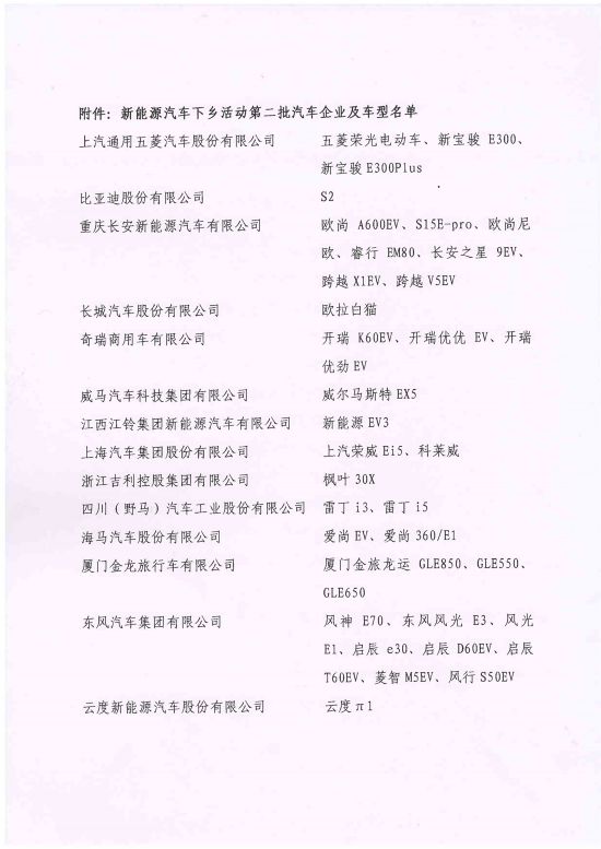 人民網(wǎng)北京9月2日電(王紫)9月1日,中國汽車工業(yè)協(xié)會(huì)公布了第二批參與新能源汽車下鄉(xiāng)活動(dòng)的企業(yè)和車型名單。名單中包括上汽通用五菱、比亞迪、長安汽車、長城汽車、奇瑞商用車等在內(nèi)的14家企業(yè),及其旗下的共計(jì)36款車型。