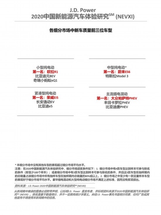 研究結(jié)果顯示,上汽大眾(105 個 PP100)獲得插電混動車市場新車質(zhì)量第一名,寶馬(108個PP100)位列插電混動車市場第二位。蔚來(109 個 PP100)獲得純電動車市場新車質(zhì)量第一名,特斯拉(113個PP100)和歐拉(129個PP100)位列純電動車市場第二和第三位;車型層面,歐拉R1榮獲小型純電動細分市場第一;榮威Ei5榮獲緊湊型純電動細分市場第一;蔚來ES6摘得中型純電動細分市場第一;大眾帕薩特 PHEV 摘得主流插電混動細分市場第一;豪華插電混動和大型純電動細分市場因為不滿足細分市場頒獎條件,因而沒有獎項頒出。
