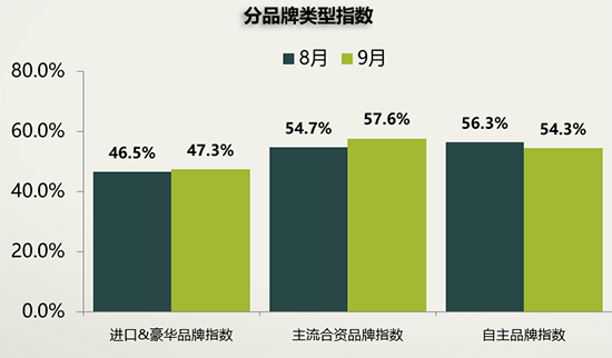 品牌類(lèi)型方面,9月份進(jìn)口&豪華品牌、主流合資品牌指數(shù)環(huán)比上升,自主品牌指數(shù)環(huán)比下降。樊宇表示,豪華品牌繼續(xù)領(lǐng)跑,庫(kù)存處于警戒線以下;合資品牌則出現(xiàn)明顯的分化,庫(kù)存壓力上升;自主品牌市場(chǎng)份額小幅回升,銷(xiāo)量穩(wěn)定增長(zhǎng),庫(kù)存壓力得到一定緩解。
