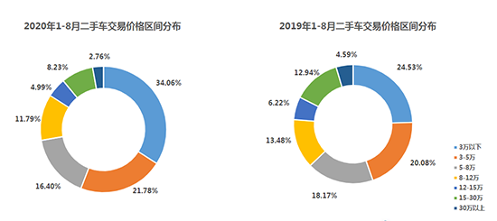 1-8月,全國(guó)二手車(chē)市場(chǎng)累計(jì)交易量811.47萬(wàn)輛,同比下降12.50%。其中,3萬(wàn)元及以下價(jià)格區(qū)間的車(chē)輛增長(zhǎng)9.53%;3-5萬(wàn)區(qū)間增長(zhǎng)1.70%;5-8萬(wàn)區(qū)間下降1.76%;8-12萬(wàn)區(qū)間下降1.69%;12-15萬(wàn)區(qū)間下降1.23%;15-30萬(wàn)區(qū)間下降4.71%;30萬(wàn)區(qū)間以上下降1.83%。