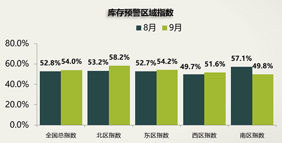 從區(qū)域情況來(lái)看,北區(qū)指數(shù)為58.2%,東區(qū)指數(shù)為54.2%,西區(qū)指數(shù)為51.6%,南區(qū)指數(shù)為49.8%,是唯一位于警戒線以下的區(qū)域。樊宇表示,臨近四季度,經(jīng)銷(xiāo)商進(jìn)入秋季補(bǔ)庫(kù)周期,而南方地區(qū)的廣東、湖南、湖北等省份銷(xiāo)量增速較快,庫(kù)存壓力略有緩和。