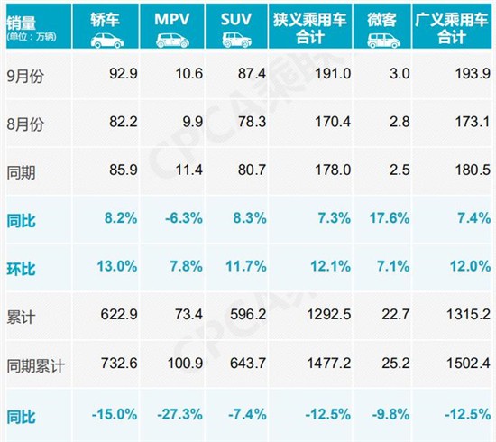 分車型來看,9月,SUV與轎車市場依舊維持較高增速,均實(shí)現(xiàn)超過8%的同比增長,環(huán)比增長也同為兩位數(shù)。而MPV市場則獨(dú)自低迷,再現(xiàn)同比下滑走勢。