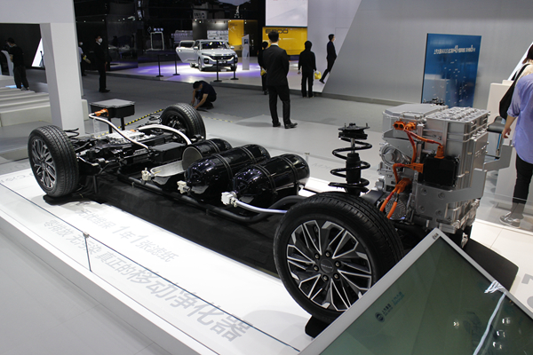 新能源汽車底盤展示模型。人民網(wǎng) 鄂智超 攝