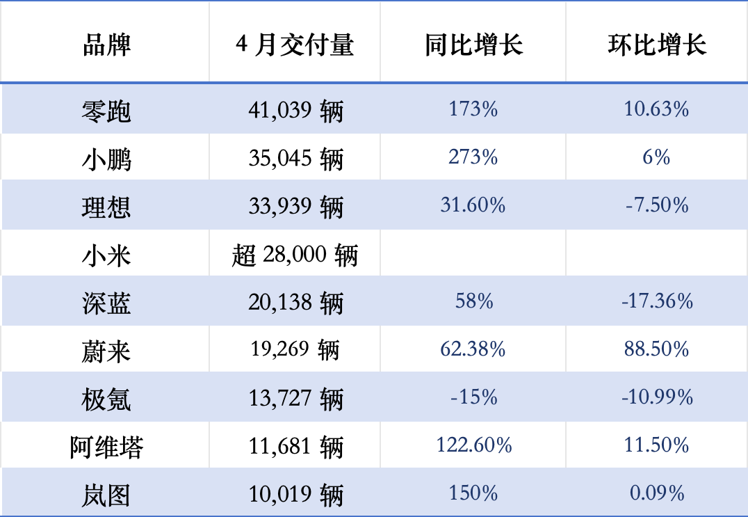 盡管行業(yè)淘汰賽加速,但多數(shù)新勢(shì)力品牌仍保持強(qiáng)勁增長(zhǎng)勢(shì)頭。4月零跑、小鵬、嵐圖、阿維塔等都實(shí)現(xiàn)了翻倍增長(zhǎng),單品牌月交付量超2萬(wàn)輛的品牌達(dá)到了5個(gè),去年同期只有兩個(gè)品牌月交付量超2萬(wàn)輛。