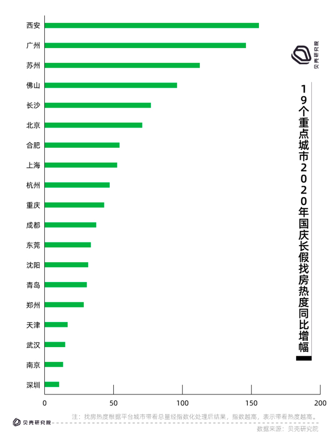 10月9日,貝殼找房發(fā)布了2020年城市“十一”找房熱度(二手房市場(chǎng)),全國(guó)多個(gè)城市找房活躍度同比去年均不同程度增長(zhǎng),其中西安、廣州、蘇州樓市相對(duì)火熱,經(jīng)紀(jì)人總帶看量同比出現(xiàn)了翻倍增長(zhǎng);而深圳、南京樓市趨冷,總帶看量增幅排在19個(gè)重點(diǎn)城市最后。