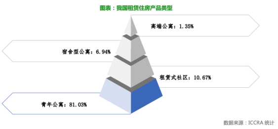 報(bào)告指出,我國(guó)租賃住房類型整體呈現(xiàn)出明顯的“正金字塔”形態(tài):滿足年輕人需求的青年公寓占比最大,超過80%;其次是滿足新市民需求的租賃式社區(qū),占比超過10%;面對(duì)企業(yè)基層員工的宿舍型公寓占比8.62%;服務(wù)式公寓比例僅為1.35%。